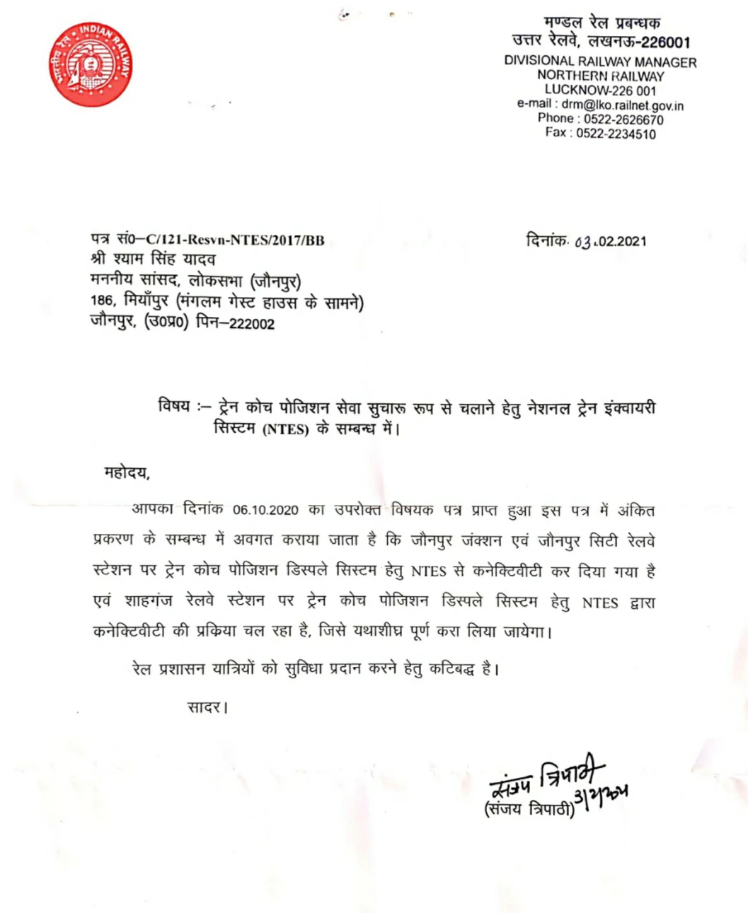 जौनपुर। सांसद जौनपुर श्याम सिंह यादव द्वारा जनपद के रेलवे स्टेशन जौनपुर जंक्शन एवं सिटी स्टेशन तथा शाहगंज स्टेशन पर नेट्स NTES कनेक्टिविटि के लिये रेलवे को लगातार किये जा रहे पत्राचार के क्रम में अब रेलवे ने नेट्स की कनेक्टिविटि कर दिया है।