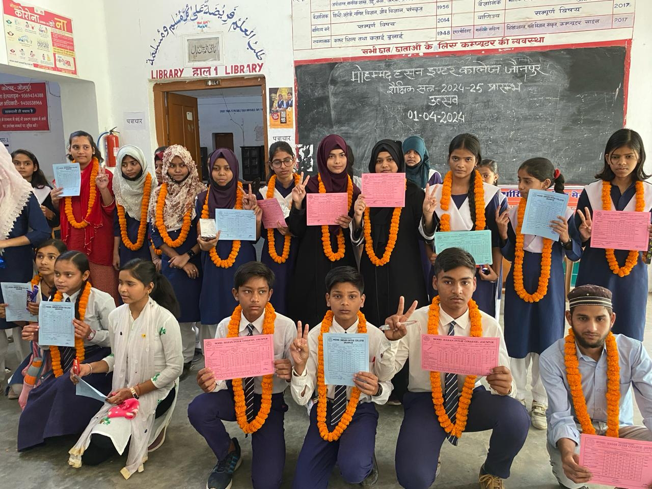 जौनपुर। मोहम्मद हसन इंटर कॉलेज में 01 अप्रैल 24 को नवीन शैक्षिक सत्र 2024 - 25 उत्सव के रूप में मनाया गया। इस उत्सव में विद्यालय के प्रवेश गेट पर नव प्रवेशी छात्राओं को माला पहनाकर एवं पुष्प वर्षा कर उत्साह वर्धन किया गया। परिषदीय परीक्षा 2024 तथा मूल्यांकन कार्य समाप्ति के पश्चात लगभग 1 माह बाद 01 अप्रैल को विद्यालय पुनः खुल गया। छात्र/छात्राओं में काफी उत्साह देखने को मिला पहले दिन छात्र /छात्राओं को रिजल्ट कार्ड वितरित किया गया। कक्षा में प्रथम, द्वितीय,तथा, तृतीय, स्थान प्राप्त करने वाले छात्रों को सम्मानित किया गया। जिससे छात्र/छात्राएं अत्यधिक उत्साहित दिखे। इस अवसर पर विद्यालय के प्रबंधक डॉ अब्दुल कादिर खान द्वारा कक्षा में प्रथम ,द्वितीय ,तृतीय स्थान प्राप्त करने वाले छात्रों को पुरस्कार वितरित किया गया ।साथ-साथ आगे की पढ़ाई में किसी भी प्रकार की बाधा आने पर पूर्ण सहयोग देने का आश्वासन दिया गया। इस उत्सव में विद्यालय के सभी छात्रों को मतदान हेतु जागरुक करते हुए बताया गया। कि दिनांक 25 मई 2024 को मतदान के दिन वह अपने परिवार के तथा गांव मोहल्ले के ऐसे सदस्य जो 18 वर्ष की आयु पूर्ण कर चुके हैं उनको मतदान करने हेतु जागरूक करें इस अवसर पर विद्यालय के प्रधानाचार्य नासिर खान सहित सभी शिक्षक एवं कर्मचारी गण उपस्थित रहे।